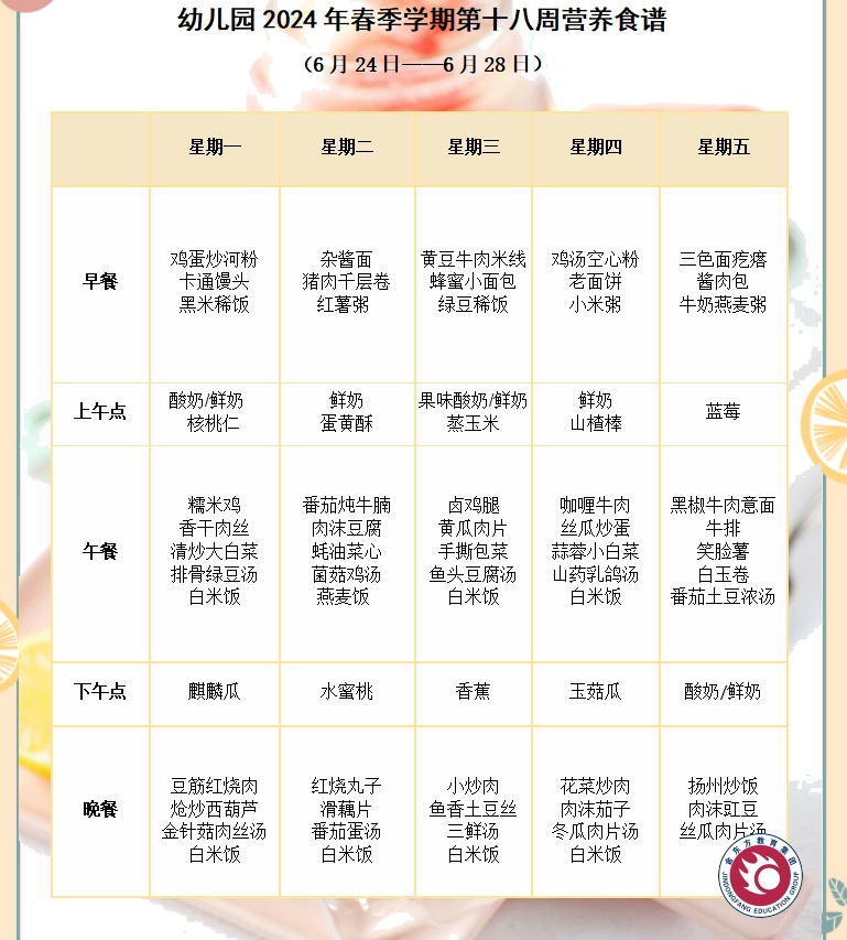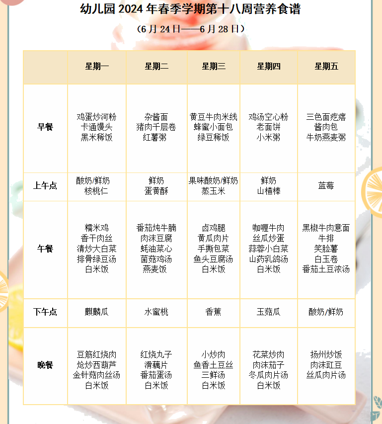 幼儿园2024年春季学期第十八周营养食谱
