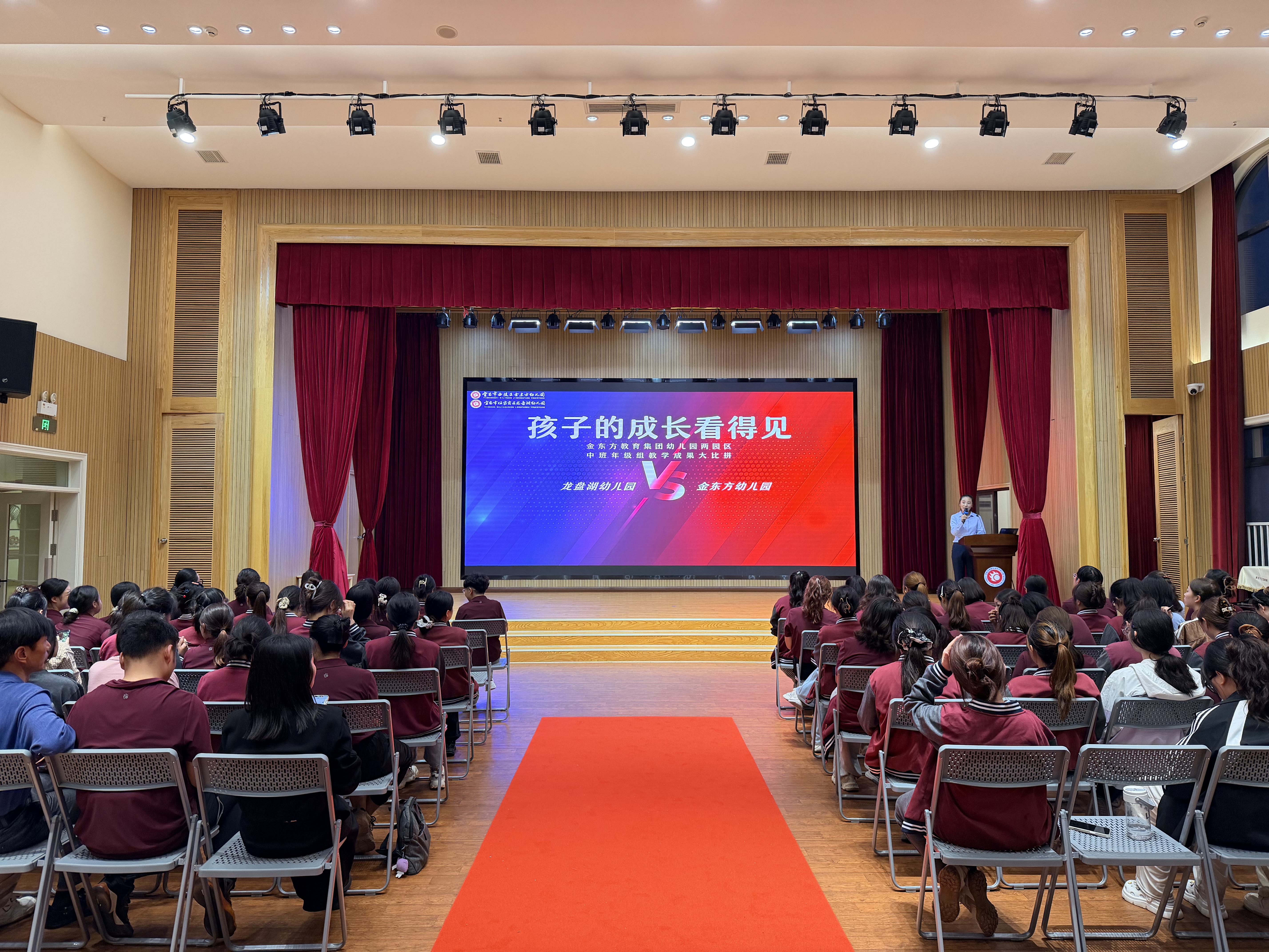 活动在热烈的氛围中拉开帷幕。首轮《学前儿童行为观察与指导》现场答辩紧张激烈,展现了教师们扎实的理论功底。随后的教学成果比拼环节,龙幼与金幼中班年级组通过不同形式生动的案例汇报和展演,清晰呈现了幼儿在语言表达与交流、身体发育与健康、科学与技术、社会性学习等多领域的成长足迹。趣味互动与“突出进步奖”的推举,则让现场充满了掌声与感动,彰显了团队互学共进的良好氛围。