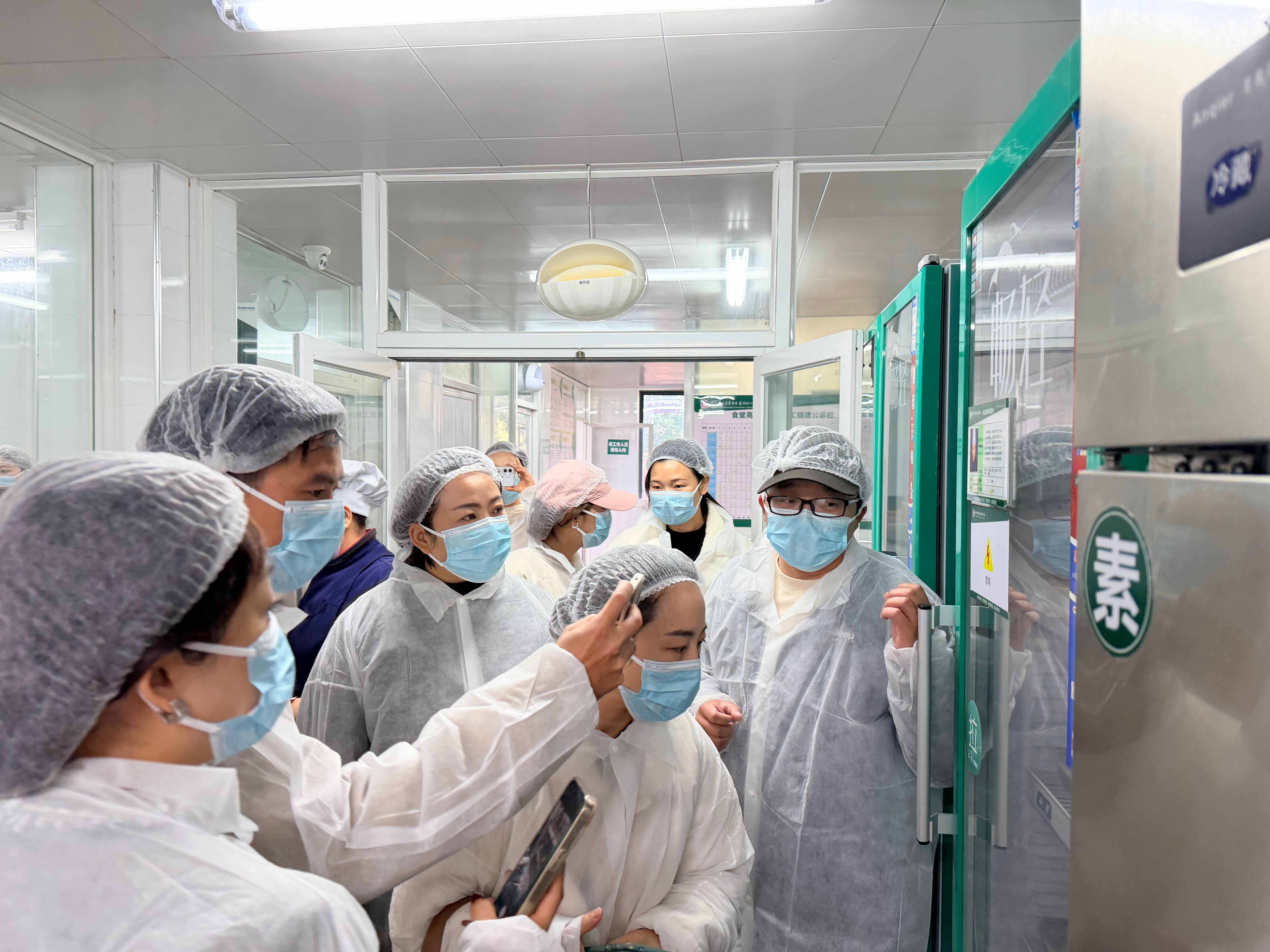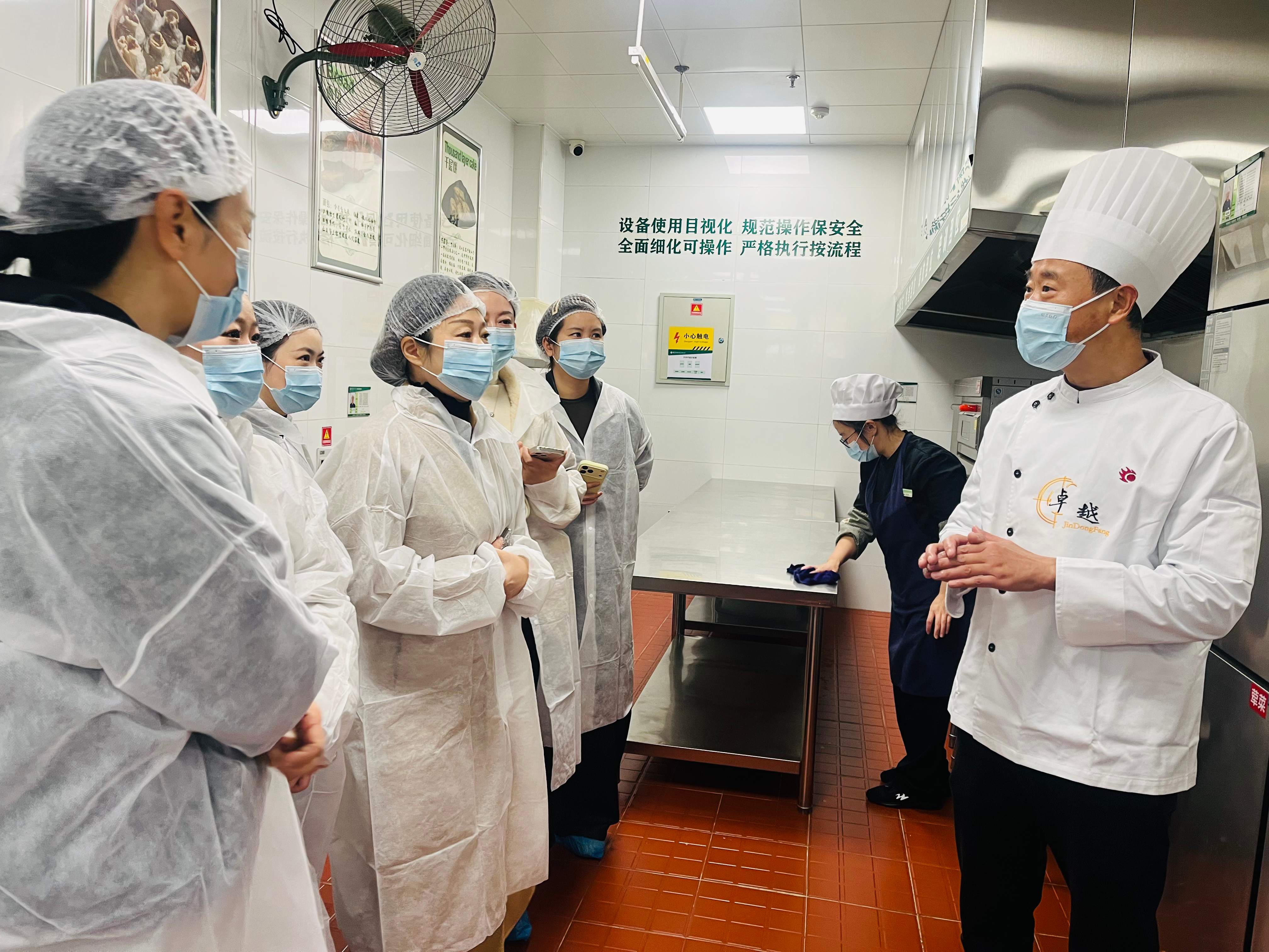 在集团营养膳食中心总管任瑰和两园区后勤主任的带领下,家长们依次参观了食堂的仓储区、加工区与烹饪区,深入了解食材采购、验收、储存及加工全流程。幼儿园始终坚持食堂自办不外包、食材统一招标配送,确保来源安全、品质可控。