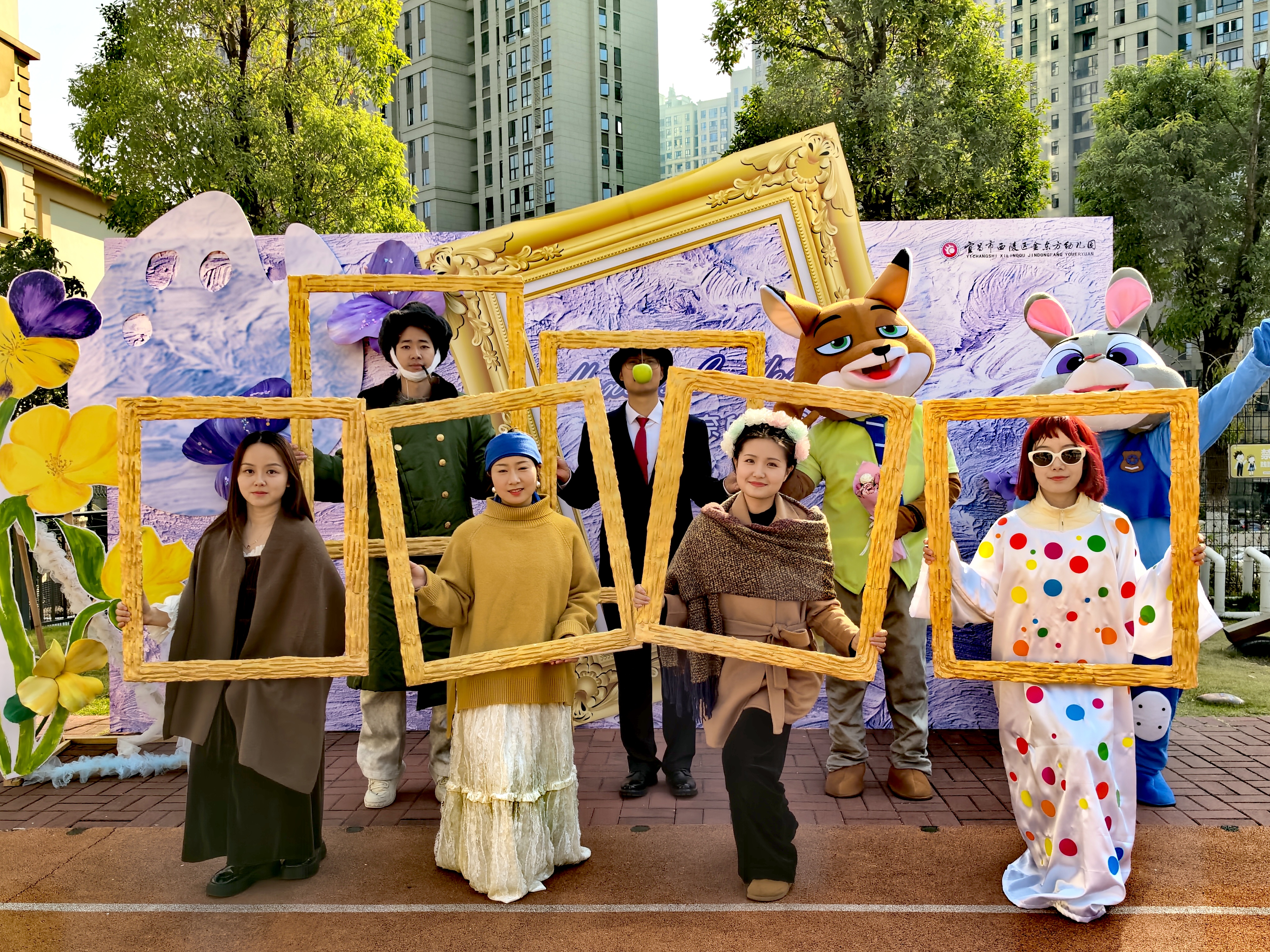 入口处,“艺术大师迎宾通道”早已排起长龙,老师们化身戴珍珠耳环的“少女”、微笑的蒙娜丽莎、留着独特络腮胡的梵高、抱苹果的玛格丽特、眉间绽放花朵的弗里达卡罗、波点南瓜的草间婆婆,连《疯狂动物城》的尼克、朱迪也“空降”现场。经典名画和动漫角色跨次元同框,与孩子们击掌、比心、合影,瞬间把艺术氛围和欢乐情绪拉满。