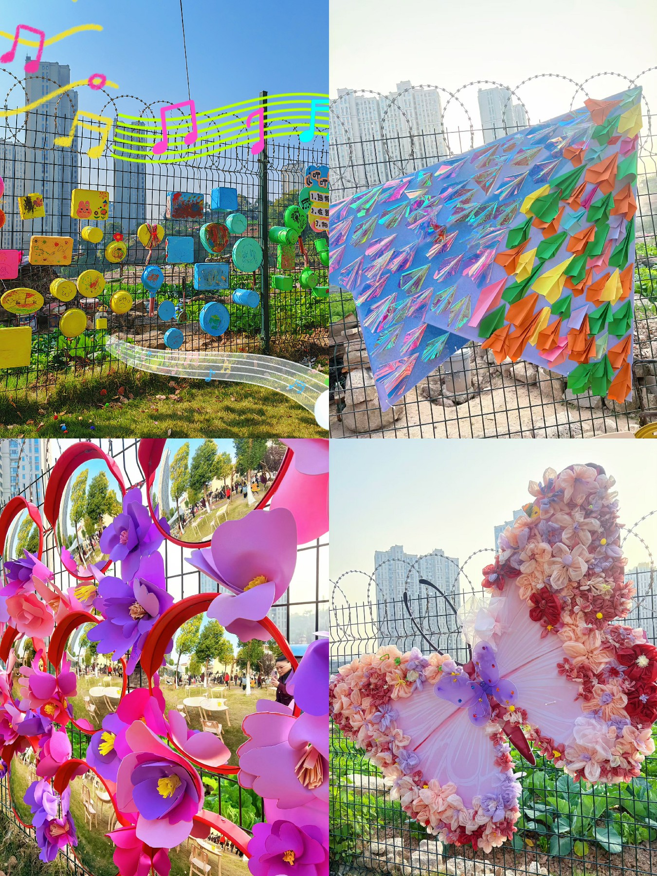 自主创作区人气尤为火爆。树叶、松果、旧衣、纸盒、水果网托等低结构材料被亲子家庭“秒变”艺术品:石头开出“向日葵”、口罩折叠成“绣球花”、毛线缠绕成“风铃花”……孩子们把完成的作品摆在班级展台,操场转眼间成为流动的童画博物馆。班级协作环节,孩子们转战围网开启“集体任务”:叮叮当当的彩绘器皿墙、莫奈镜花园、蝴蝶新衣、彩虹蜜语……家长和孩子齐动手,不一会儿,长长的围网便开成一条“立体花河”,远远望去,像莫奈的油画在风中翻页,无人机也为之驻足盘旋。