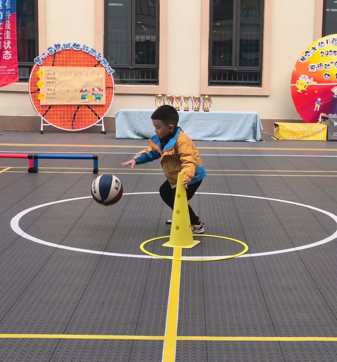 中班组精心设计了两项体能闯关活动。篮球障碍闯关环节,孩子们运球绕桩、运球移桩等,篮球在手中灵活运转;体能闯关环节则融合了平衡、跳跃、鱼跃前滚翻等多种动作技能,孩子们化身"闯关小勇士",在道道关卡中挑战自我。家长们的全程陪伴与参与,让活动更添温馨与乐趣。