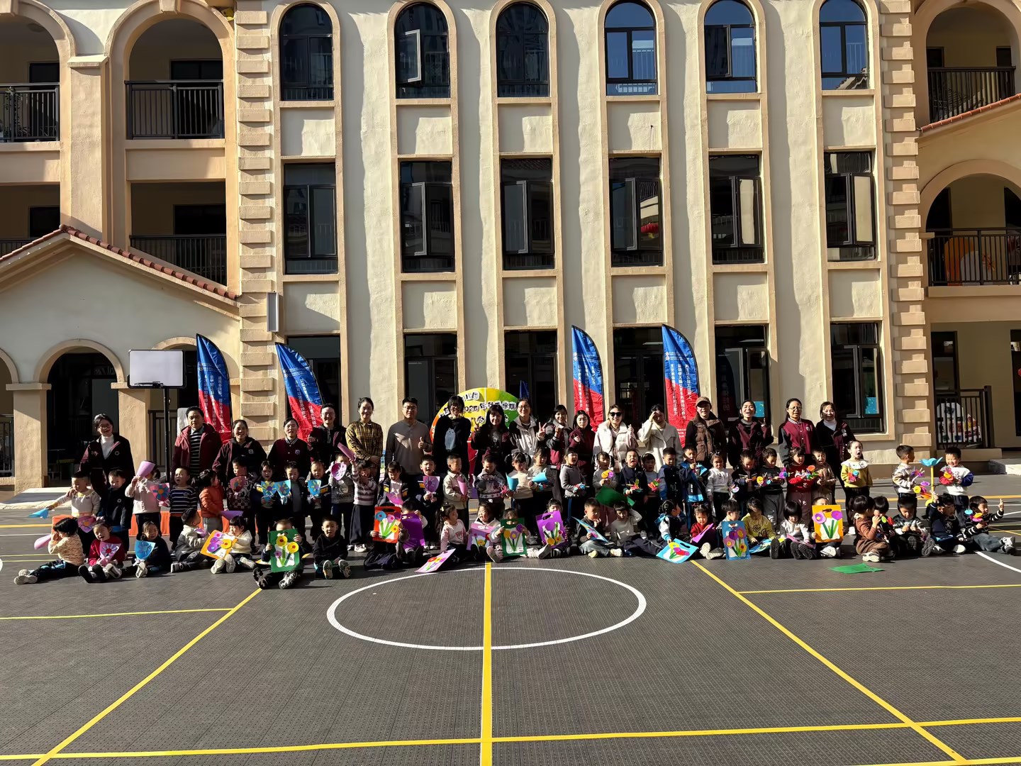 小班年级组的活动充分考虑到幼儿年龄特点,以趣味性和参与性为核心。活动在欢快的集体热身操中拉开序幕,随后各班开展了丰富多彩的体能集体游戏。最精彩的是各班体能循环闯关游戏,老师们巧妙设计了适合小班孩子的运动项目,让孩子们在游戏中发展基本动作技能。活动最后,孩子们亲手制作并互送手工花束礼物,将运动与感恩教育巧妙结合,场面温馨感人。